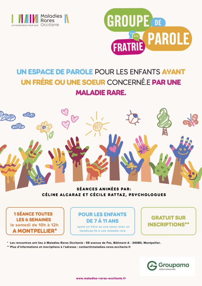 Pour plus d’information, vous pouvez contacter notre secrétariat au 04 67 57 05 59 ou vous rendre sur notre site internet à l’adresse : Groupe de parole fratrie maladie rare - Maladies Rares Occitanie